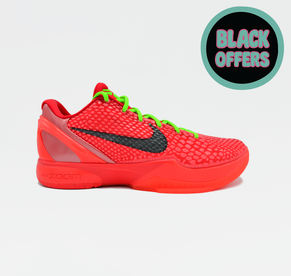 Experience the future and pay tribute to a legend with the Nike Kobe 6 Protro Reverse Grinch. This highly-anticipated sneaker takes a new approach to the iconic Grinch colorway. Featuring a vibrant Bright Crimson upper that embodies Kobe's energy on the court, this shoe is a must-have for any collection. The snakeskin texture on the upper is a nod to the Black Mamba himself, while the black Swooshes and Electric Green accents add an electrifying touch to this standout piece.