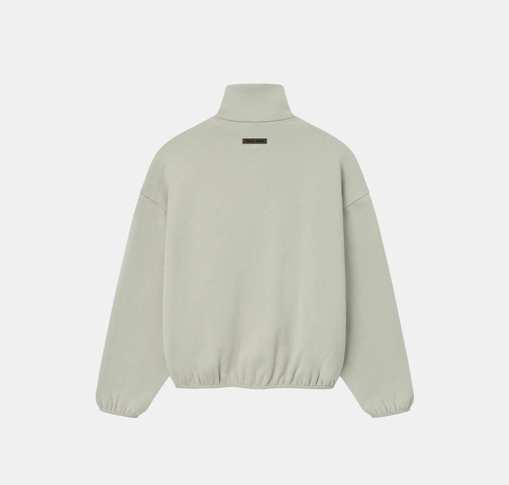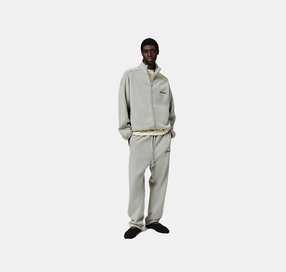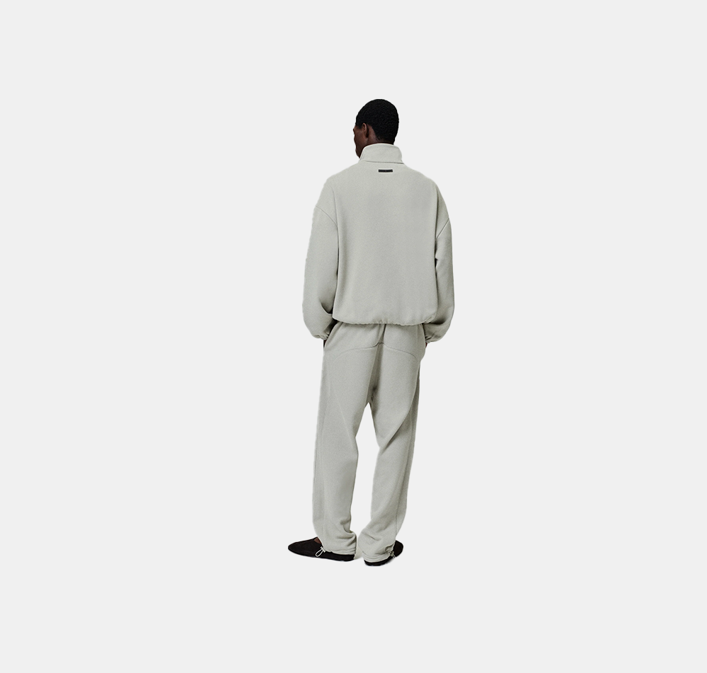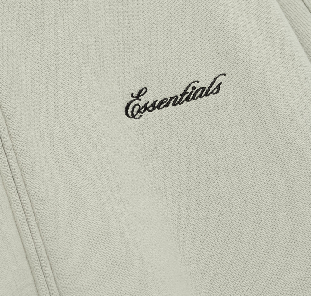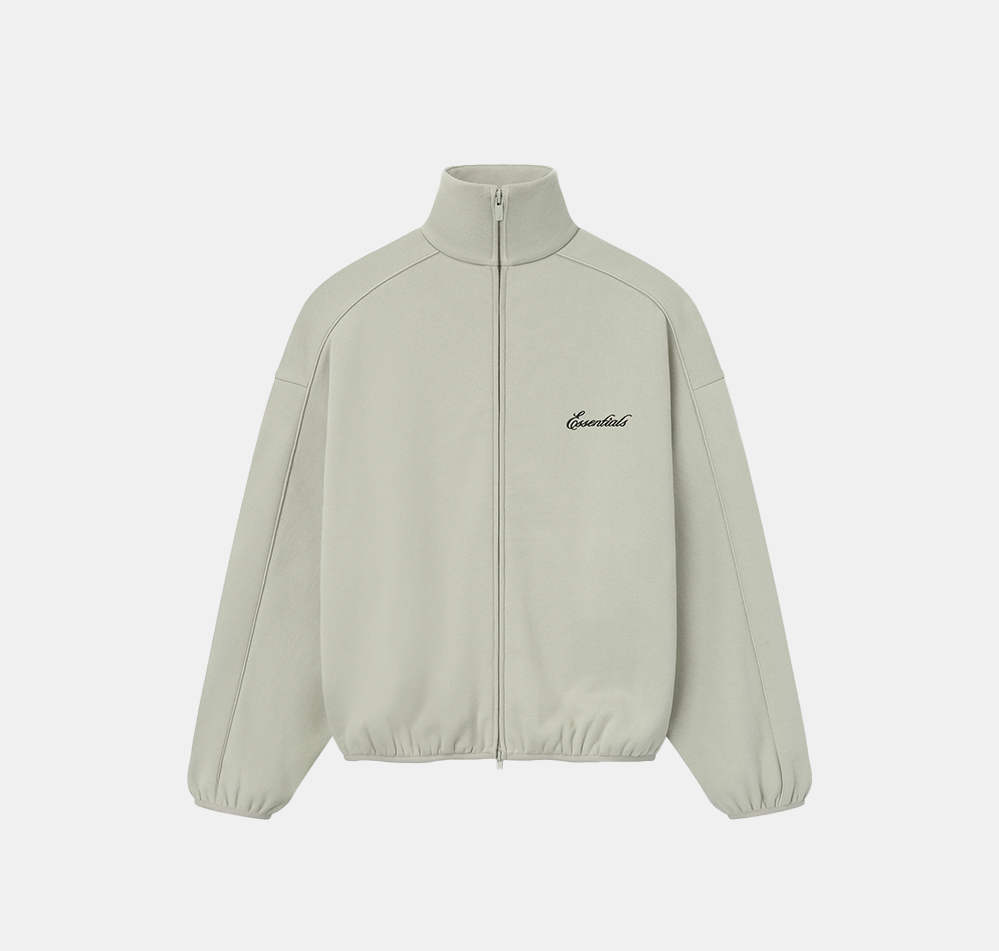 The Modern Fit Track Jacket is made from 380gsm core fleece, providing outstanding comfort and structure. The piece features a modern fit forming wider relaxed proportions with a cropped length. The new embroidered "Essentials" script logo is located on the left chest, while a Fear of God Essentials rubberized label is positioned at the back collar. Additional details include a full zip front, side pockets, and elasticized piping on the cuffs and waistband.