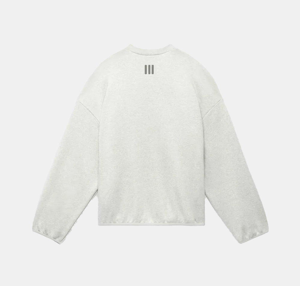 The Adidas x Fear of God Athletics Performance Cotton Fleece Crewneck in 'Medium Grey Heather' is all about quality and comfort, with its heather cotton fleece fabric. Voluminous proportions are featured in the body and sleeves, along with functional elements like side seam pockets, a bonded waist hem, and elastic binding on the collar and sleeve. Eye-catching branding includes a puff print adidas Fear of God logo and a raised metallic 3 bar logo at the back collar.