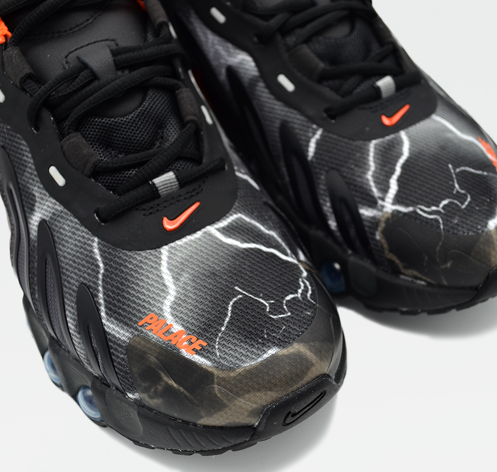 When Palace first saw the Dn8, they immediately noticed the parallels to other iconic Nike models. By leaning into heritage design, they created a shoe with Nike DNA spun in a new, fresh way. The Air Max Plus is channeled through the TPU fingers that slash across the shoe's upper. Color blocking is inspired by the classic Nike Shox R4. All-over lightning graphics combined with the Nike x Palace branding complete the look for a shoe that knows the past but never stops moving forward.