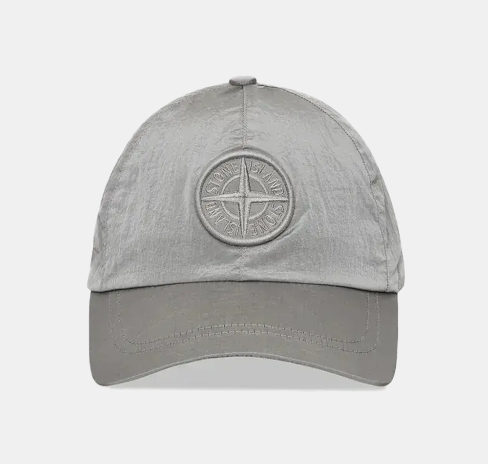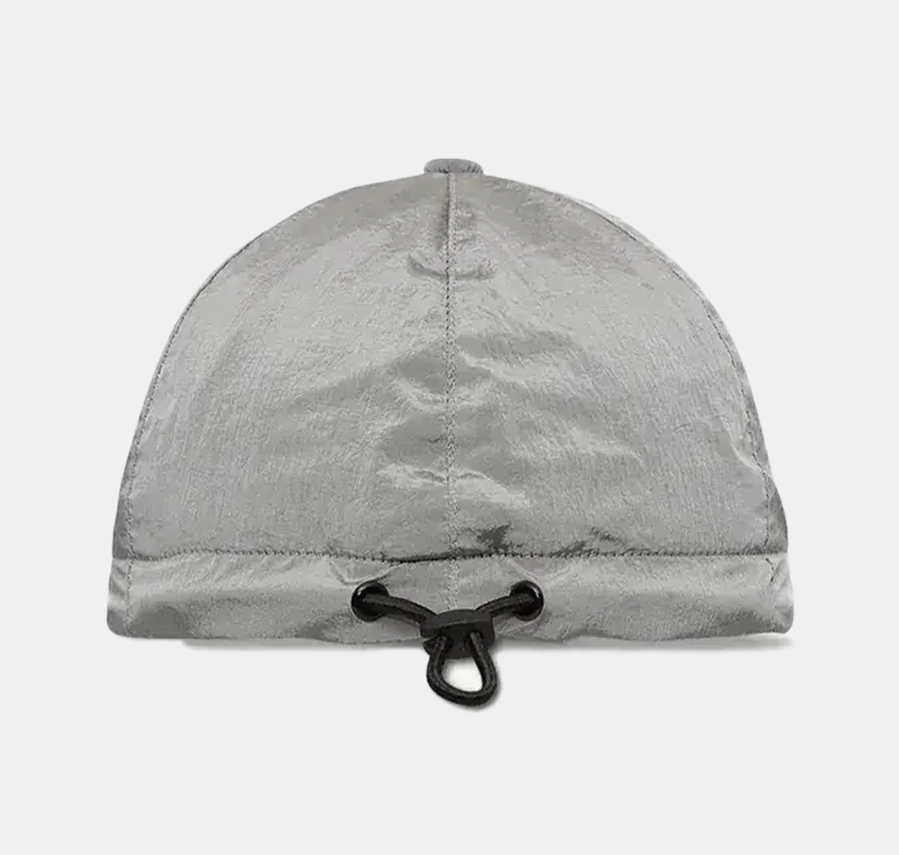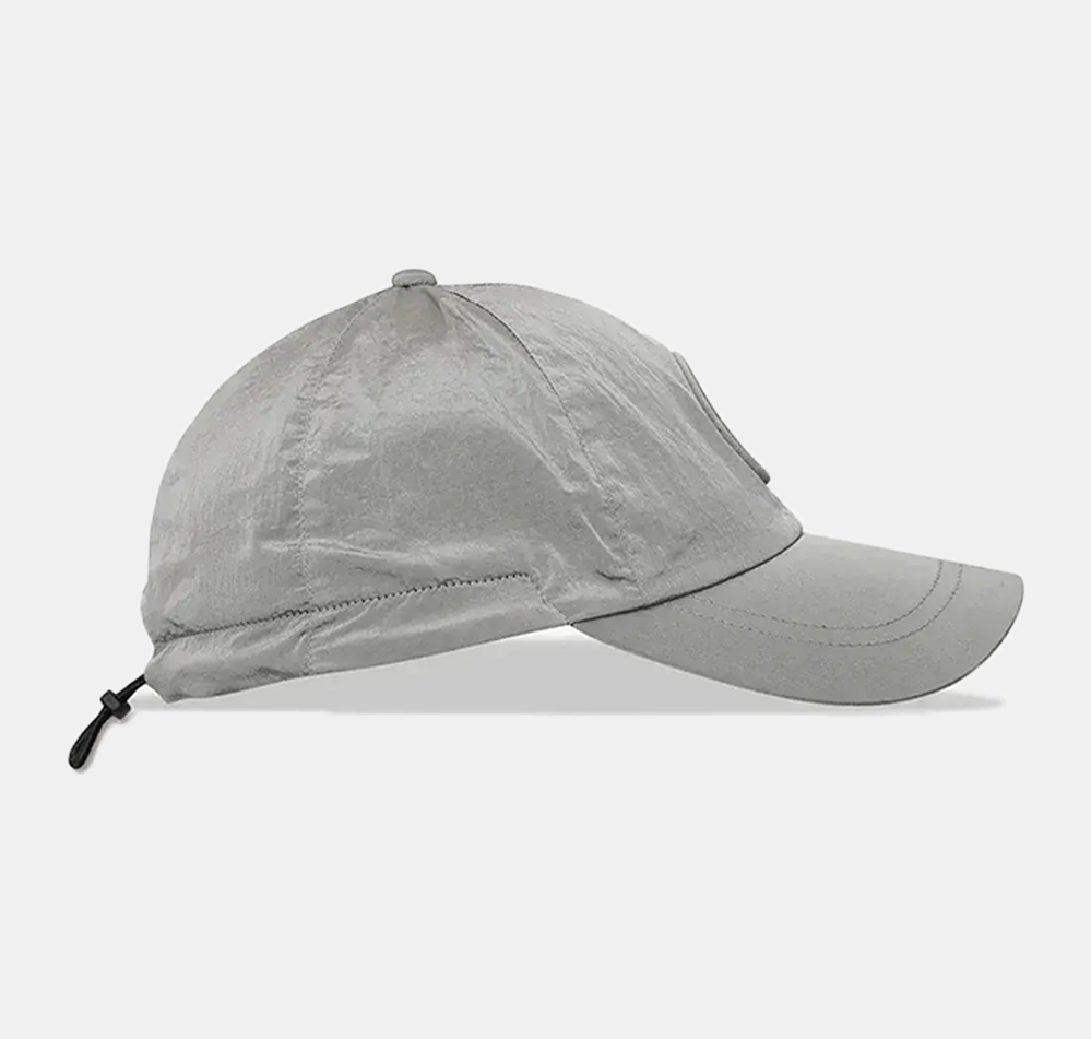 Baseball cap in Nylon Metal made with ECONYL® regenerated yarns, featuring a six-panel construction, raised Compass embroidery, and elasticated drawcord.